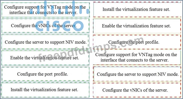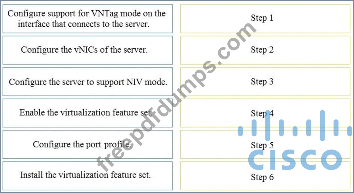 An engineer is configuring VNTag between a virtualized server and a Cisco Nexus 5500 Series switch. Drag and drop the configuration steps from the into the correct order on the right.