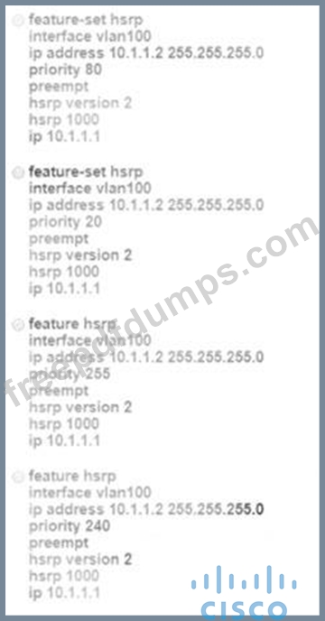 An engineer must configure a Nexus 7000 series switch for HSRP on VLAN 100. When fully functional the router must be the active master. Which set of commands must be used to implement the scenario?