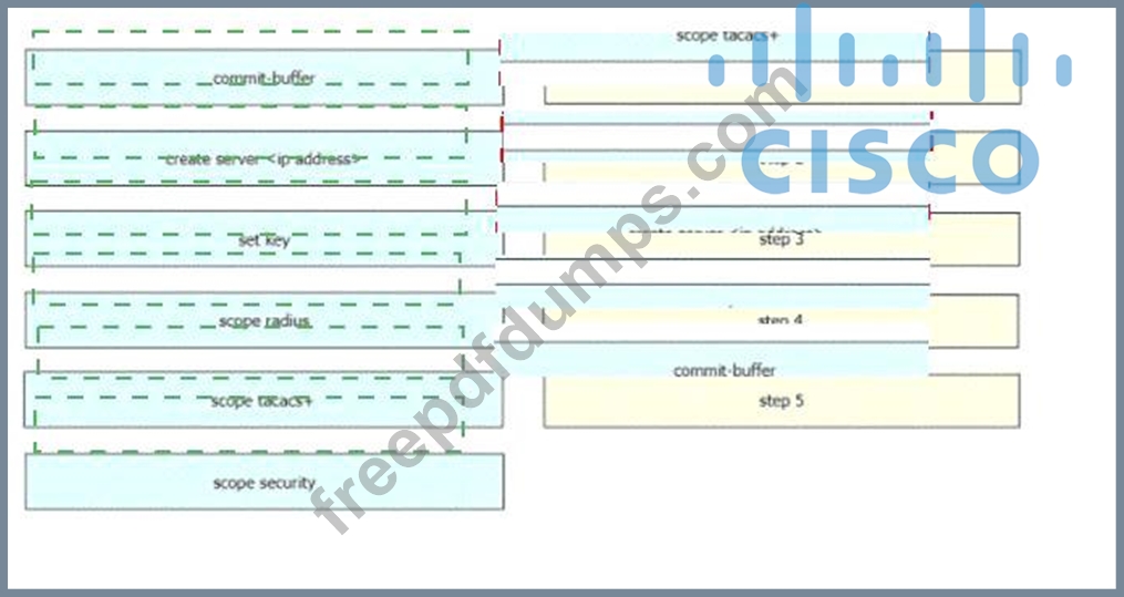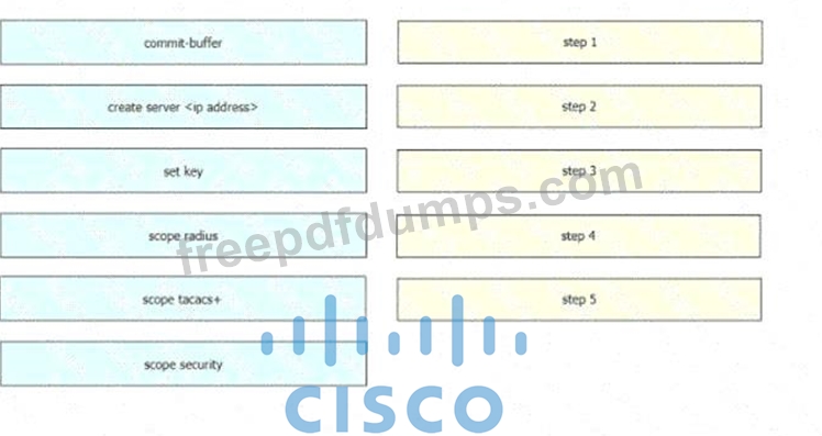 An engineer must configure remote authentication on a Cisco UCS system. The user password must be encrypted before it is sent to the authentication server. The company security policy requires the server to be based on an open standard. Drag and drop the UCS CLI AAA configuration commands from the left into the order in which they must be implemented on the right. Not all commands are used.