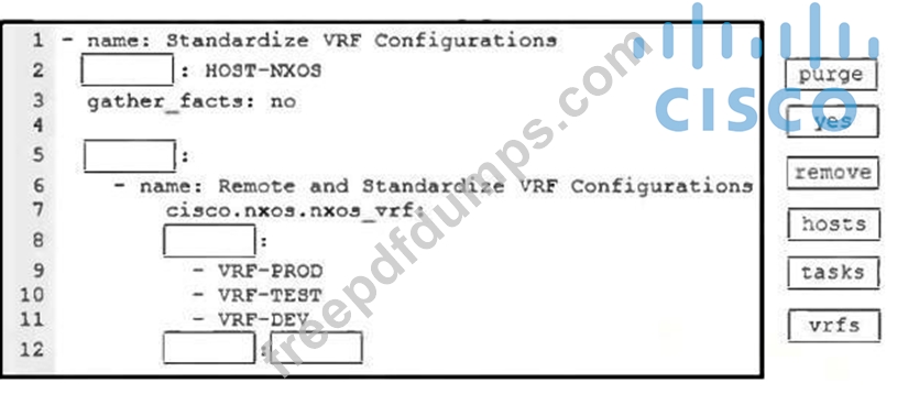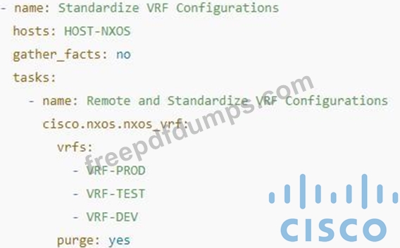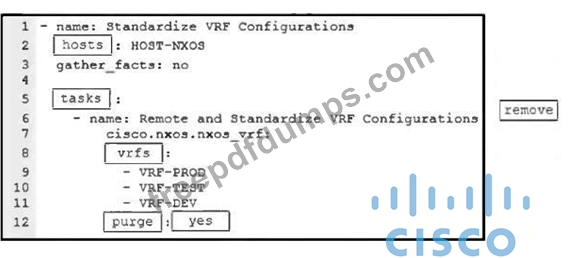 An engineer must use Ansible to standardize VRF configuration across the data center. The devices that must be configured are listed in the variable called HOST-NXOS. Also, all existing VRF configurations must be removed.