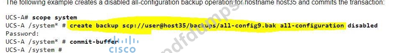 An engineer needs to make an XML backup of Cisco UCS Manager The backup should be transferred using an authenticated and encrypted tunnel and it should contain all system and service profiles configuration Which command must be implemented to meet these requirements?