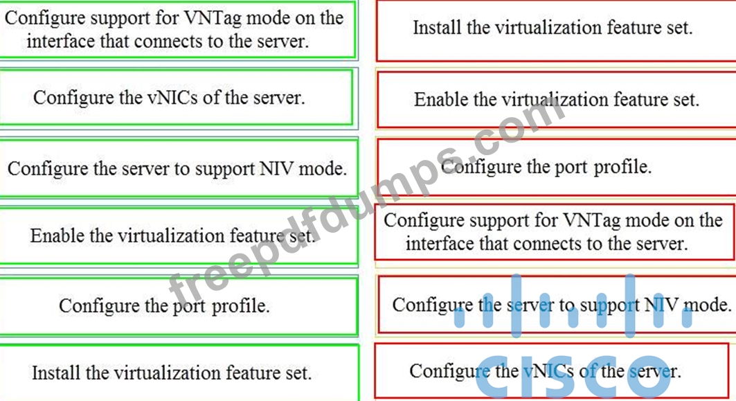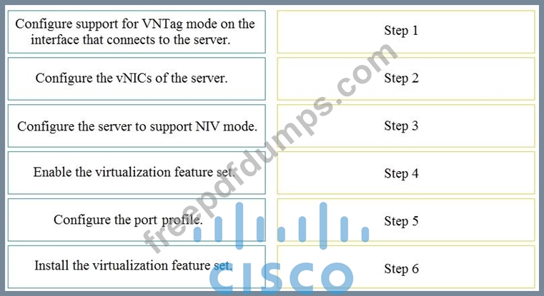 An engineer is configuring VNTag between a virtualized server and a Cisco Nexus 5500 Series switch. Drag and drop the configuration steps from the into the correct order on the right.
