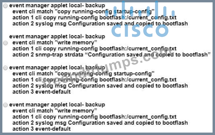 A network engineer must create an EEM script that saves a copy of the running configuration on bootflash and writes a message to syslog when a user saves the configuration to a Cisco Nexus switch. Which configuration set should be applied to complete this task?