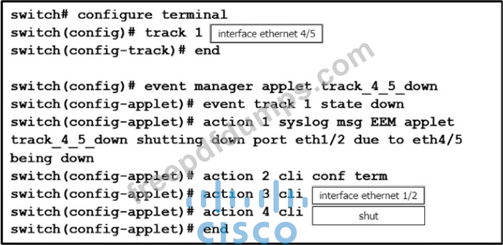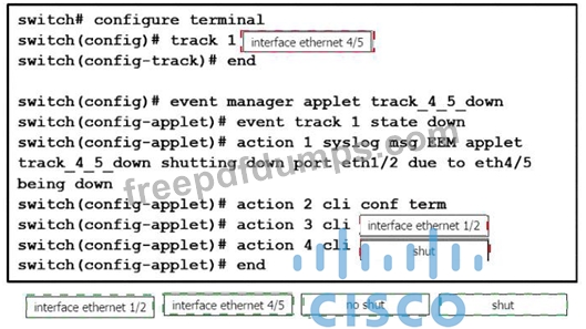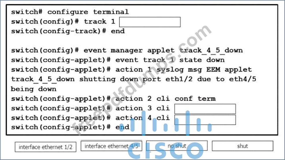An engineer must shut down the Ethernet 1/2 interface when the Ethernet 4/5 interface state is down. Drag and drop the CLI commands from the bottom onto the blanks in the exhibit to implement this EEM. Not all commands are used.