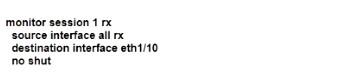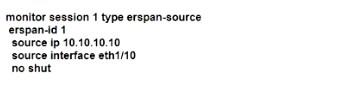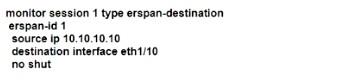 An engineer must configure an ERSPAN on a Cisco Nexus 9000 Series Switch where all traffic originates from a specific IP address. The traffic must be forwarded to a network analyzer connected to eth1/10 on the Nexus switch. Which configuration set accomplishes this goal?