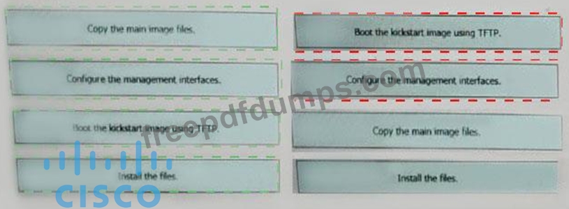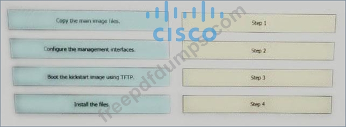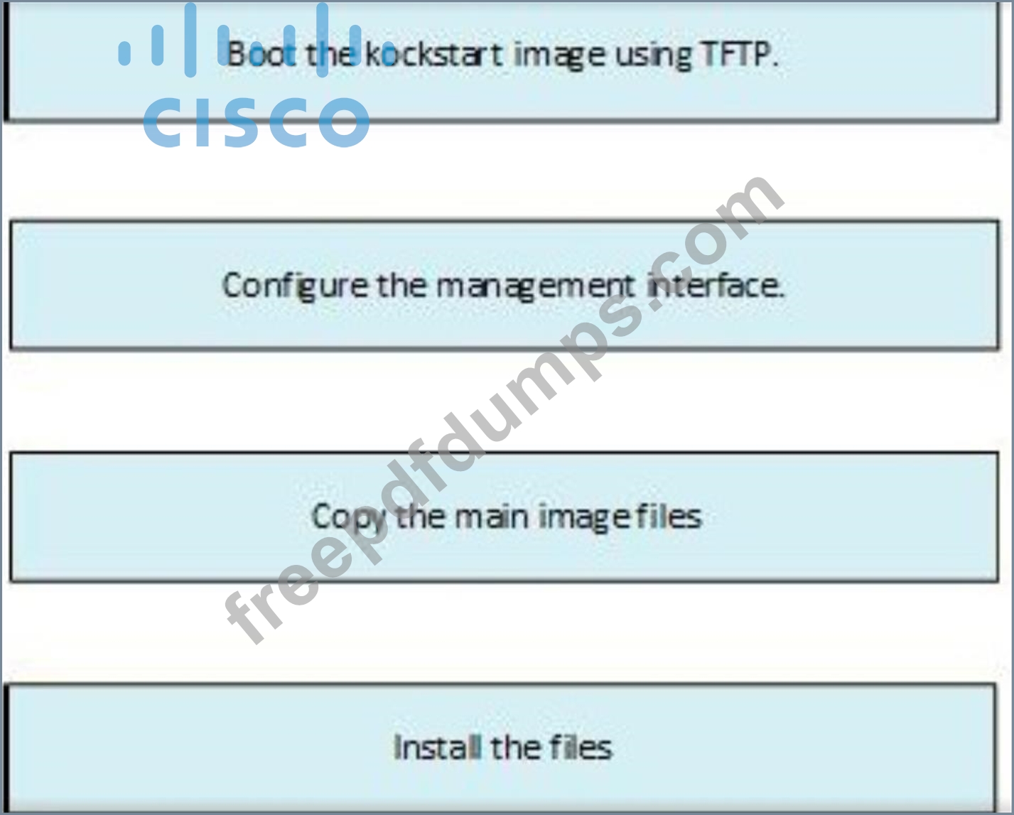 Drag and drop the steps on the left onto the order that they must be implemented on the right to recover a fabric interconnect when there is no working image on the bootflash.