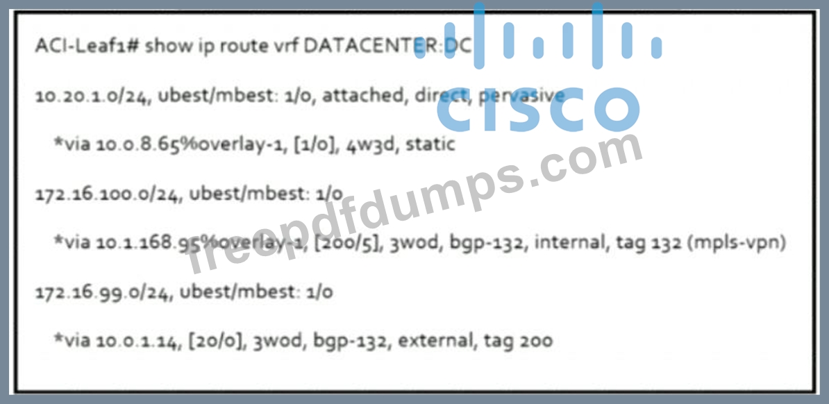 Which two statements describe the routing table of the leaf switch? (Choose two.)