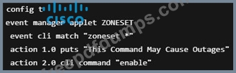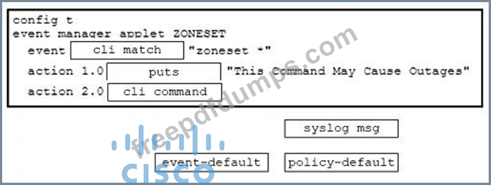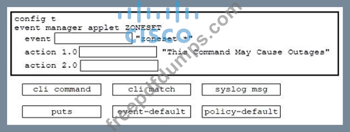 A Cisco Nexus Embedded Event Manager (EEM) must be configured to monitor when zone set commands are issued on the Cisco MDS 9000 Series Switch. The EEM applet must permit the command to execute and print a message to the terminal only. Drag and drop the code snippets from the bottom onto the blanks in the code to complete the EEM configuration. Not all code snippets are used.