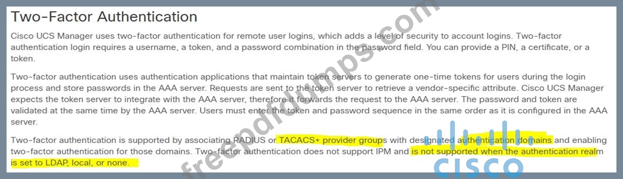 Due to new regulatory requirements from a third party, organization ABC must enable two-factor authentication for the Cisco UCS environment. The requirement is also to provide redundancy if the authentication server goes offline. Which three authentication components must be enabled to meet this requirement? (Choose three.)