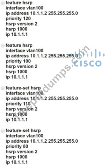 An engineer must configure a Nexus 7000 series switch for HSRP on VLAN 100. When fully functional, the router must be the active master. Which set of commands must be used to implement the scenario?