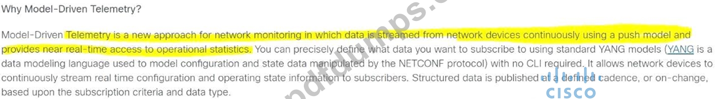 A network architect wants to propose a scalable network monitoring solution in which data is repeatedly acquired from network devices. The solution must use a push model and provide close to realtime access to operational data. Which technology must be used to meet these requirements?