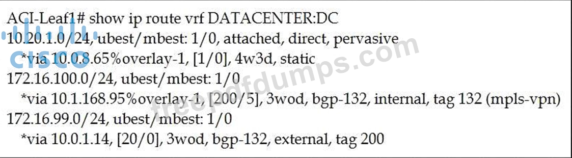 Which two statements about the routing table of the leaf switch are true? (Choose two.)