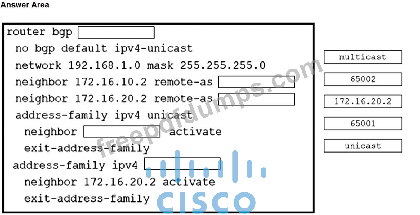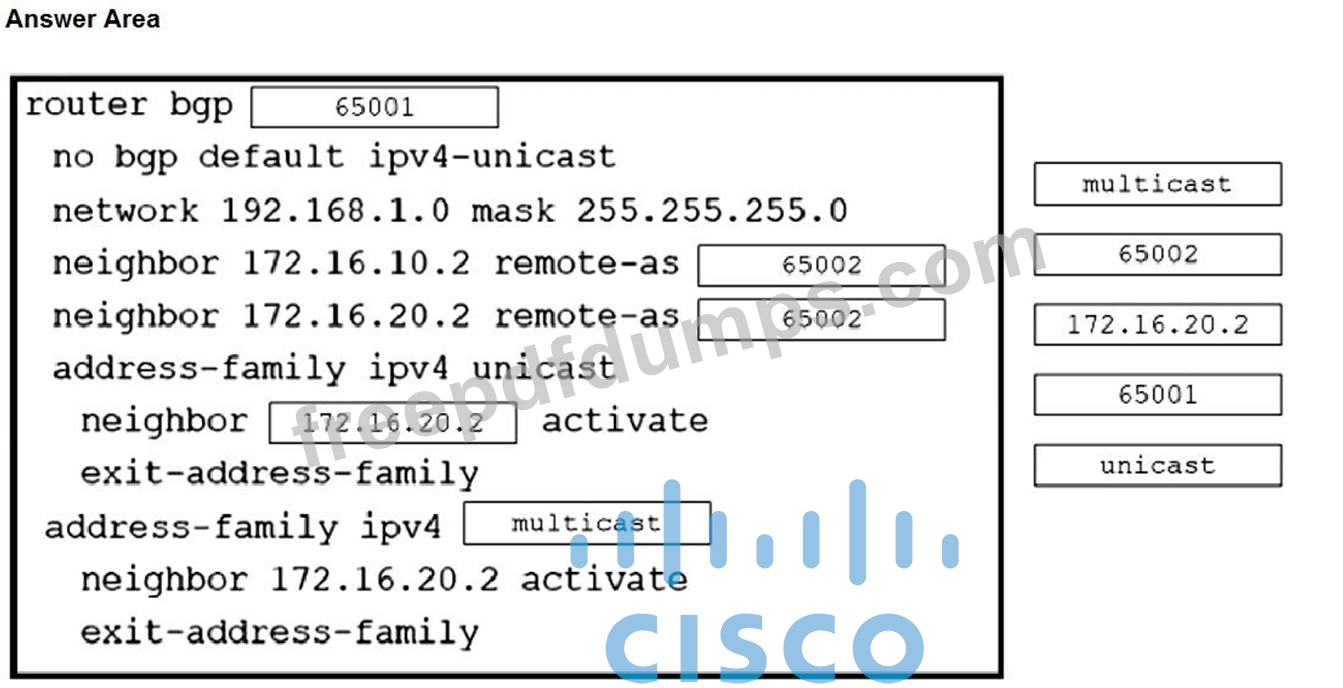 Refer to the exhibit. An engineer implements an MP-BGP deployment that must meet these requirements: