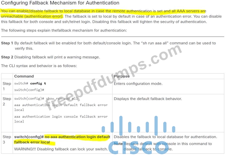 A network engineer requires remote access via SSH to a Cisco MDS 9000 Series Switch. The solution must support secure access using the local user database when the RADIUS servers are unreachable from the switches. Which command meets these requirements?