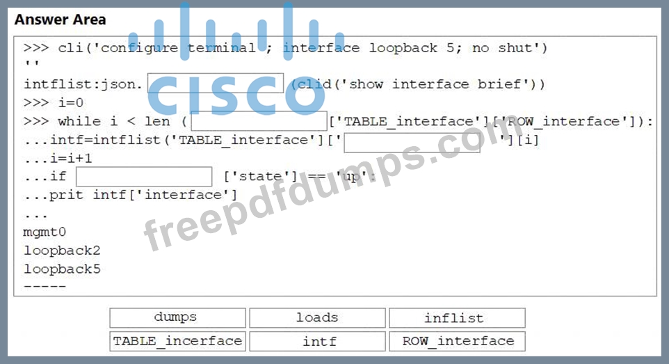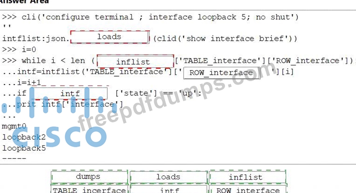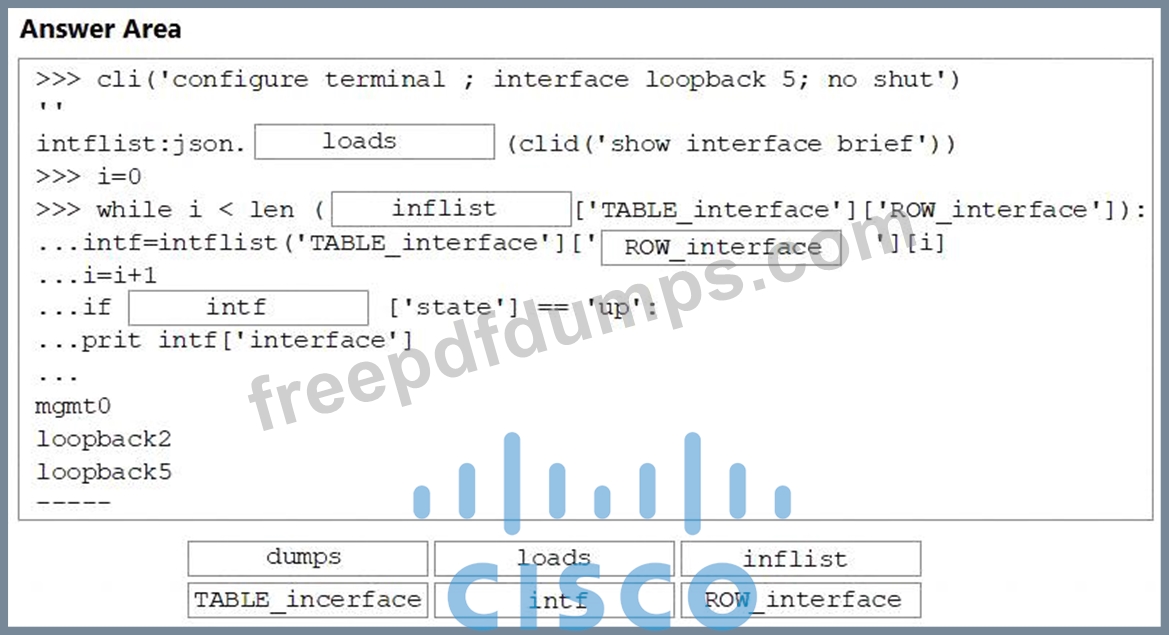 Drag and drop the command snippets from the bottom onto the boxes in the code to complete a Python script that displays a list of interfaces on a Cisco Nexus 9000 Series Switch using on-box Python. Not all command snippets are used.