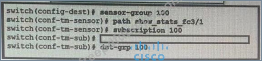 Refer to the exhibit. An engineer needs to implement streaming telemetry on a cisco MDS 9000 series switch.
