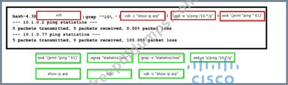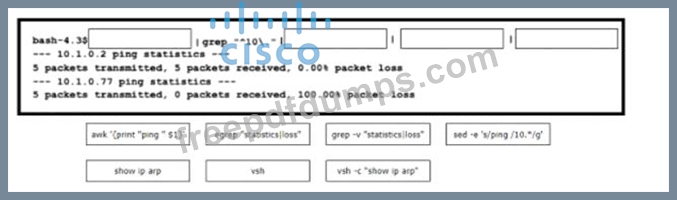 A network administrator must automate the process of pinging all the IP addresses from the 10.0.0.0/8 subnet. The subnet is already present in the ARP table of the Cisco Nexus switch. Drag and drop the bash commands to generate the desired output. Not all commands are used.