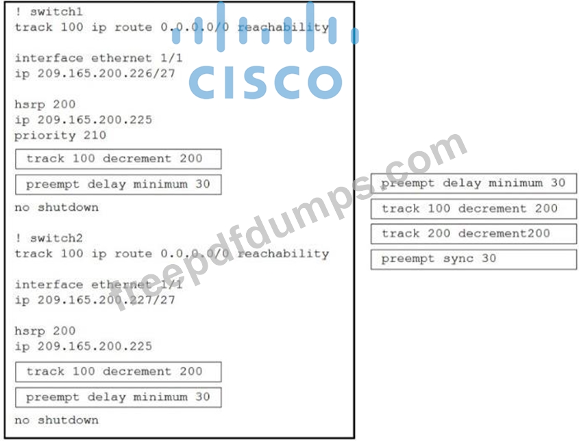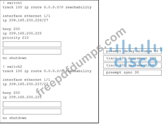 * switch2 must retain the primary role if the default gateway is not reachable Drag and drop the configuration commands from the right to the left to meet the requirements. The commands are used more than once Not all commands are used