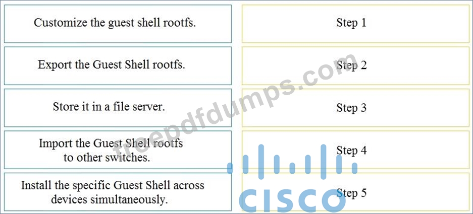 An engineer deploys a custom Guest Shell rootfs on a Nexus 9000 Series Switch. Drag and drop the steps from the left into the order required to deploy the solution on the right. Not all options are used.