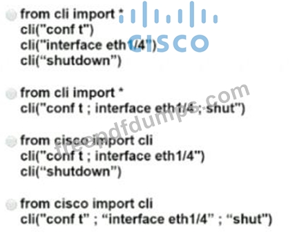 An engineer must use the python module in the guest shell of the Cisco Nexus 9000 Series switch to shutdown port Ethernet 1/4 Which command set will accomplish this?