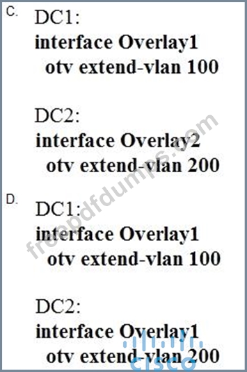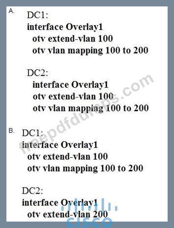 Host 1 is in VLAN 100 located is DataCenter 1 and Host2 is in VLAN200 located in DataCenter2. Which OTV VLAN mapping configuration allows Layer 2 connectivity between these two hosts?