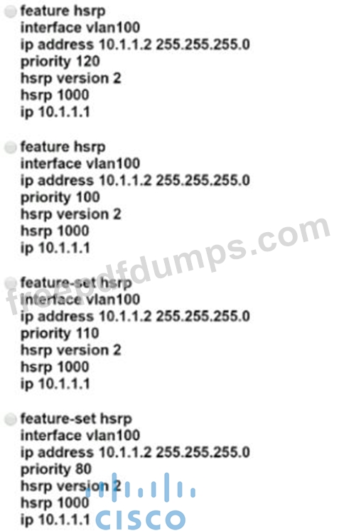 An engineer must configure a Nexus 7000 series switch for HSRP on VLAN 100. When fully functional, the router must be the active master. Which set of commands must be used to implement the scenario?