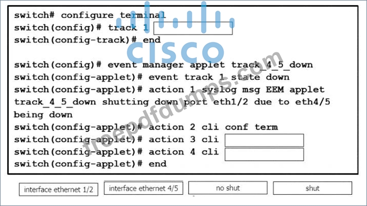 An engineer must shut down the Ethernet 1/2 interface when the Ethernet 4/5 interface state is down. Drag and drop the CLI commands from the bottom onto the blanks in the exhibit to implement this EEM. Not all commands are used.