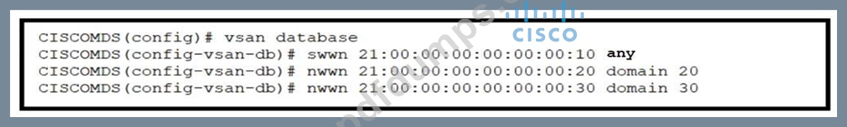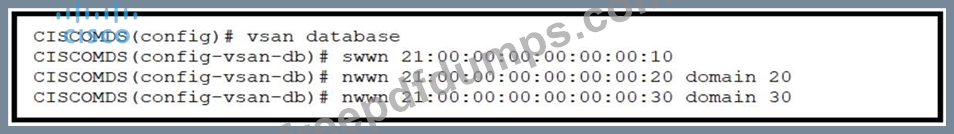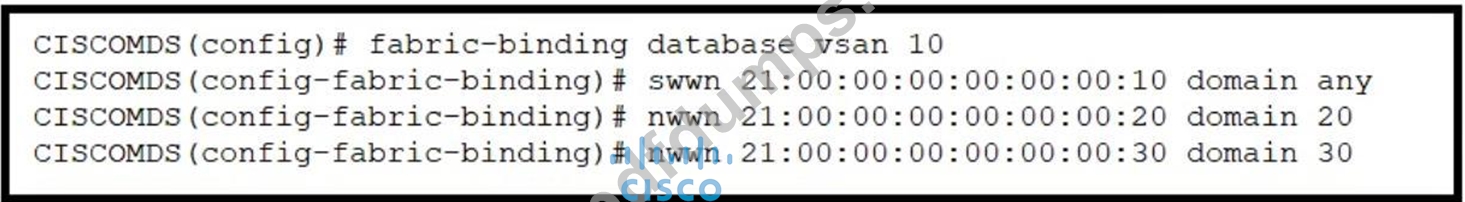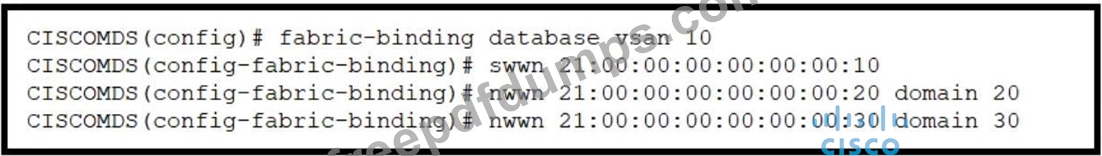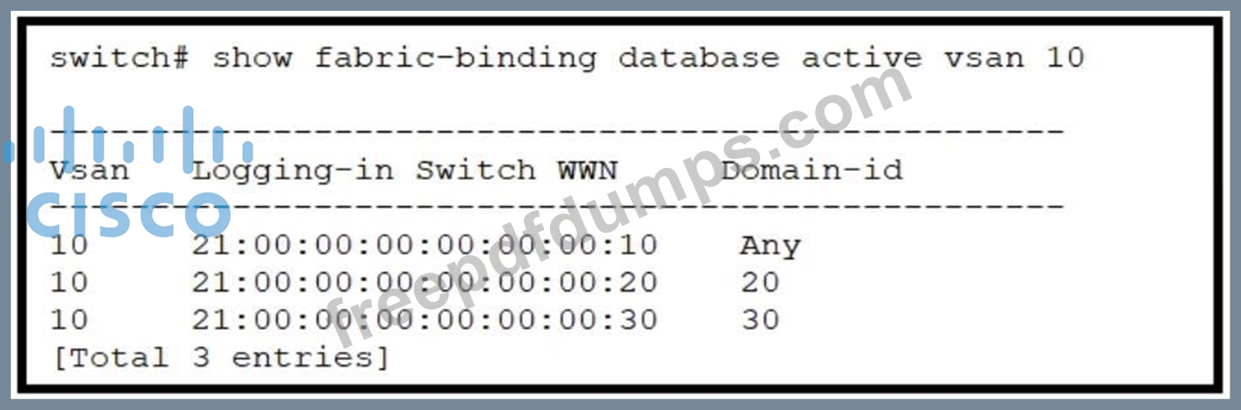 Refer to the exhibit. An engineer must configure fabric binding on a Cisco MDS 9000 Series Switch to match the output. Which fabric database configuration accomplishes this goal?