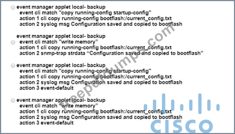 A network engineer must create an EEM script that saves a copy of the running configuration on bootflash and writes a message to syslog when a user saves the configuration to a Cisco Nexus switch. Which configuration set should be applied to complete this task?