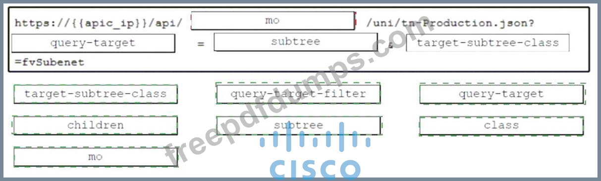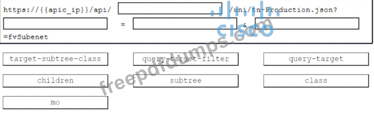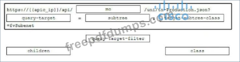 Drag and drop the keywords onto the URL request to collect all the subnets configured under tenant Production using a REST API. Not all options are used.