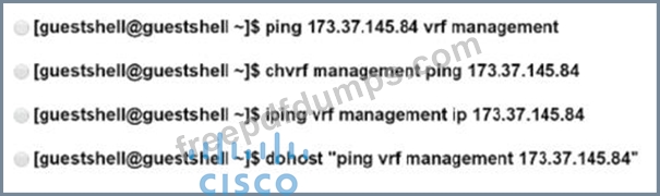 An engineer installed a new Nexus switch with the mgm0interface in vrf management. Connectivity to the rest of the network needs to be tested from the guest shell of the NX-OS. Which command tests connectivity from the shell of the NX-OS?