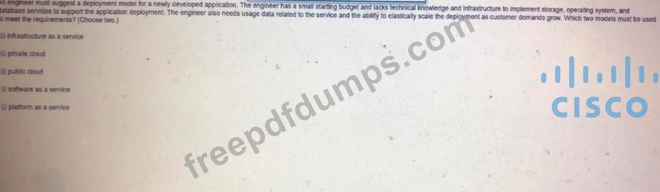 An engineer must suggest a deployment model for a newly developed application. The engineer has a small starting budget and lacks technical knowledge and infrastructure to implement store, operating system and database services to support the application deployment. The engineer also needs usage data related to the service and the ability to elastically scale the deployment as customer demands grow. Which two models must be used to meet the requirements? (Choose two)