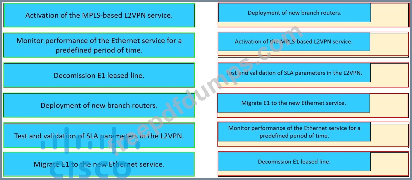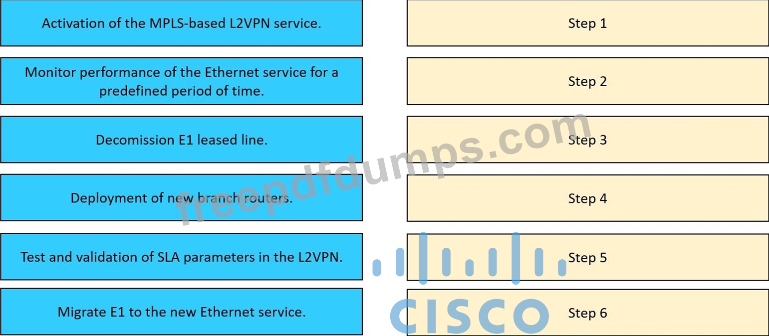 Drag and drop the implementation steps from the left onto the corresponding targets on the right in the correct order.