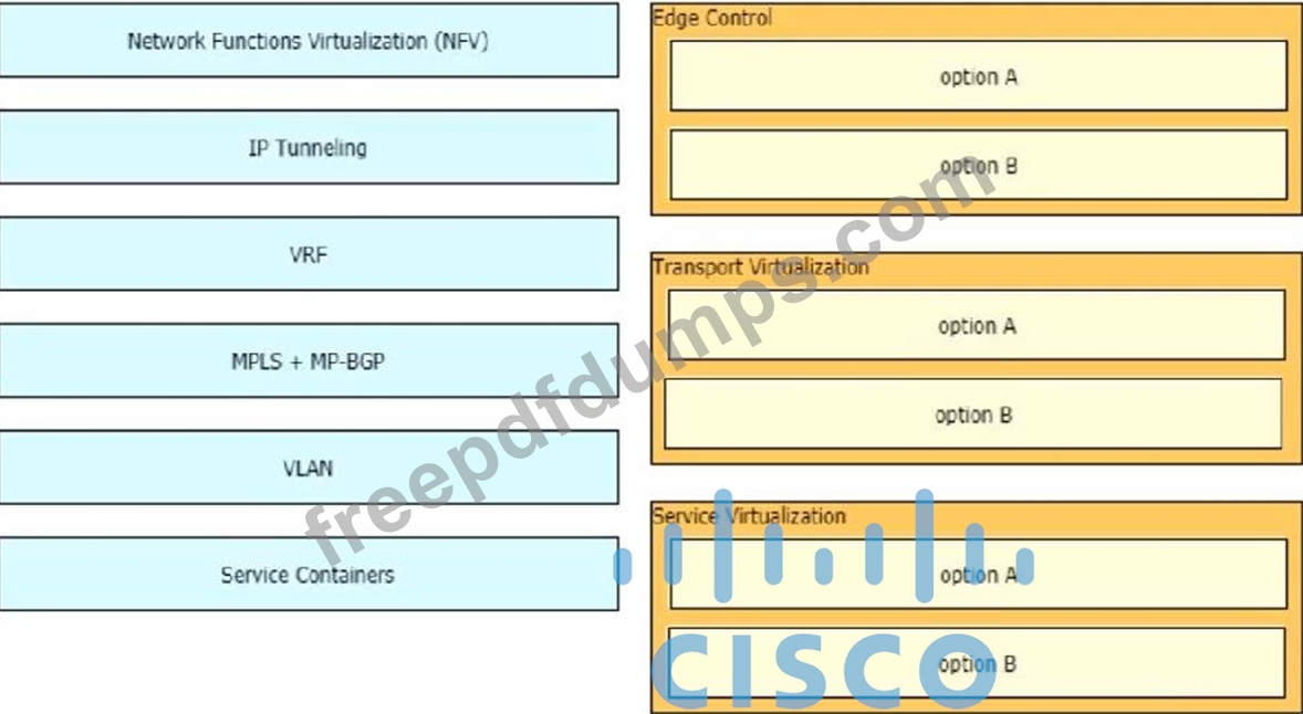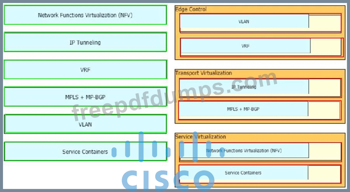 Drag and drop the end-to-end network virtualization elements from the left onto the correct network areas on the right.