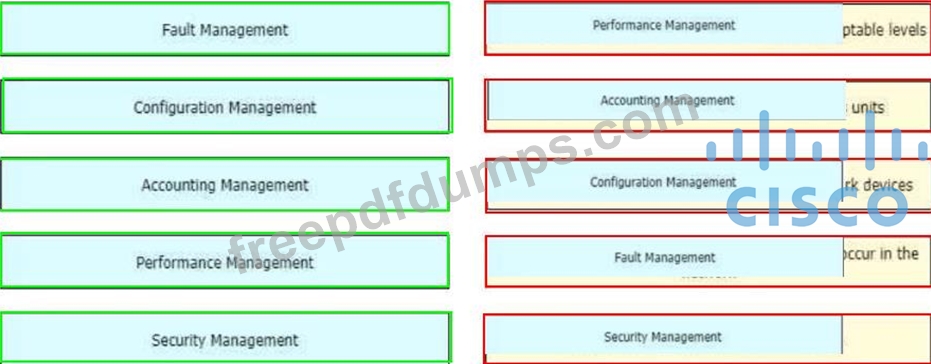 Drag and drop the FCAPS network management reference models from the left onto the correct definitions on the right.