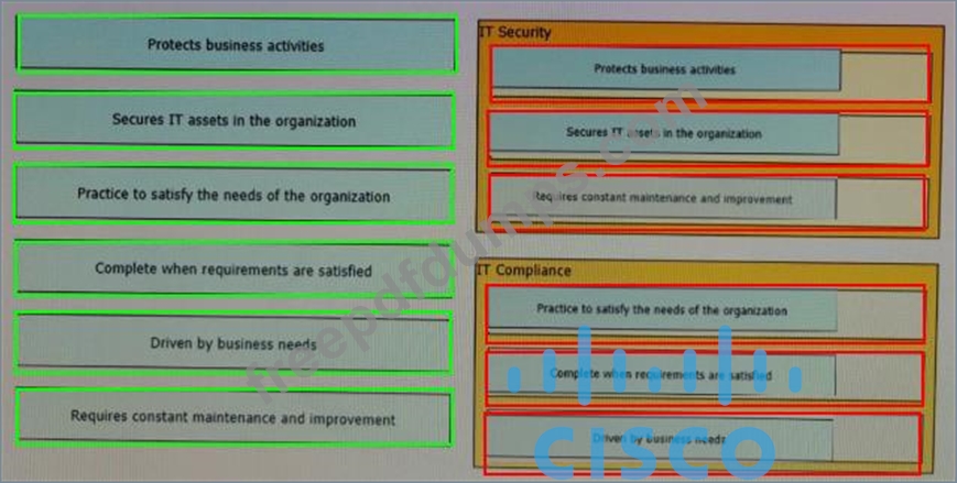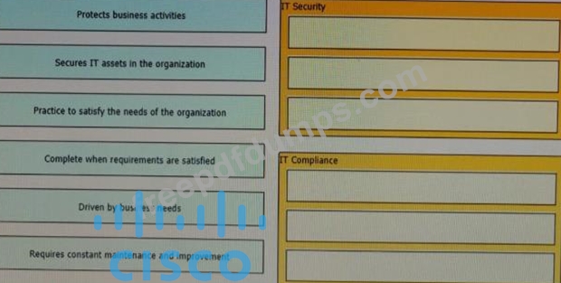 The line between security and compliance is easily blurred and is, to a large extent, a moving target Drag and drop each of the requirements on the left to the appropriate section on the right