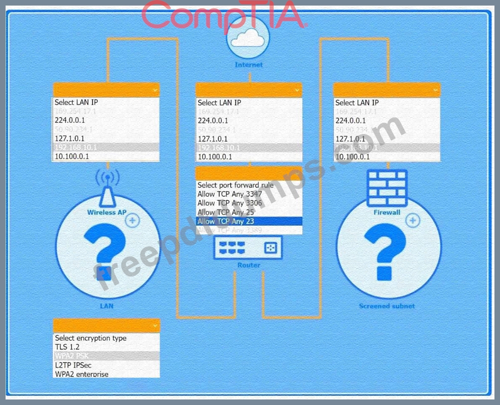 Use the drop-down menus to complete the network configuration for the customer. Each option may only be used once, and not all options will be used.