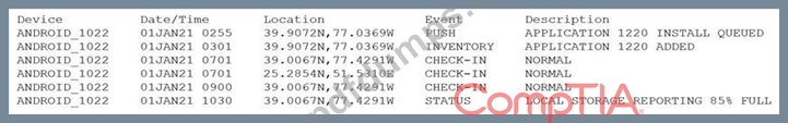 Which of the following security concerns and response actions would BEST address the risks posed by the device in the logs?