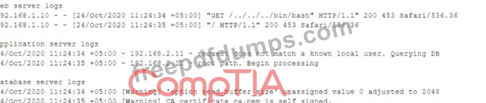 An auditor Is reviewing the logs from a web application to determine the source of an Incident. The web application architecture Includes an Internet-accessible application load balancer, a number of web servers In a private subnet, application servers, and one database server In a tiered configuration. The application load balancer cannot store the logs. The following are sample log snippets: