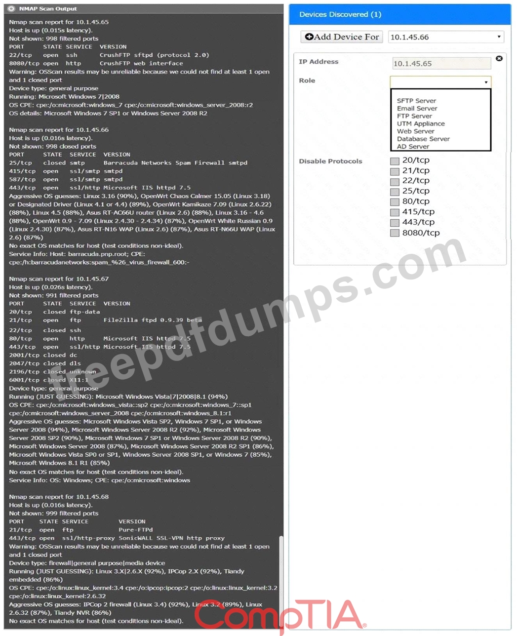 Using the Nmap output, identify the devices on the network and their roles, and any open ports that should be closed.