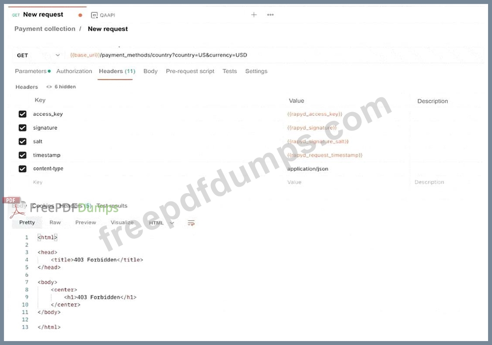 A developer reports errors when trying to access a web application. The developer uses Postman to troubleshoot and receives the following error:
