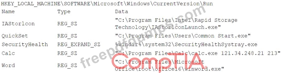 An analyst is reviewing registry keys for signs of possible compromise. The analyst observes the following entries: