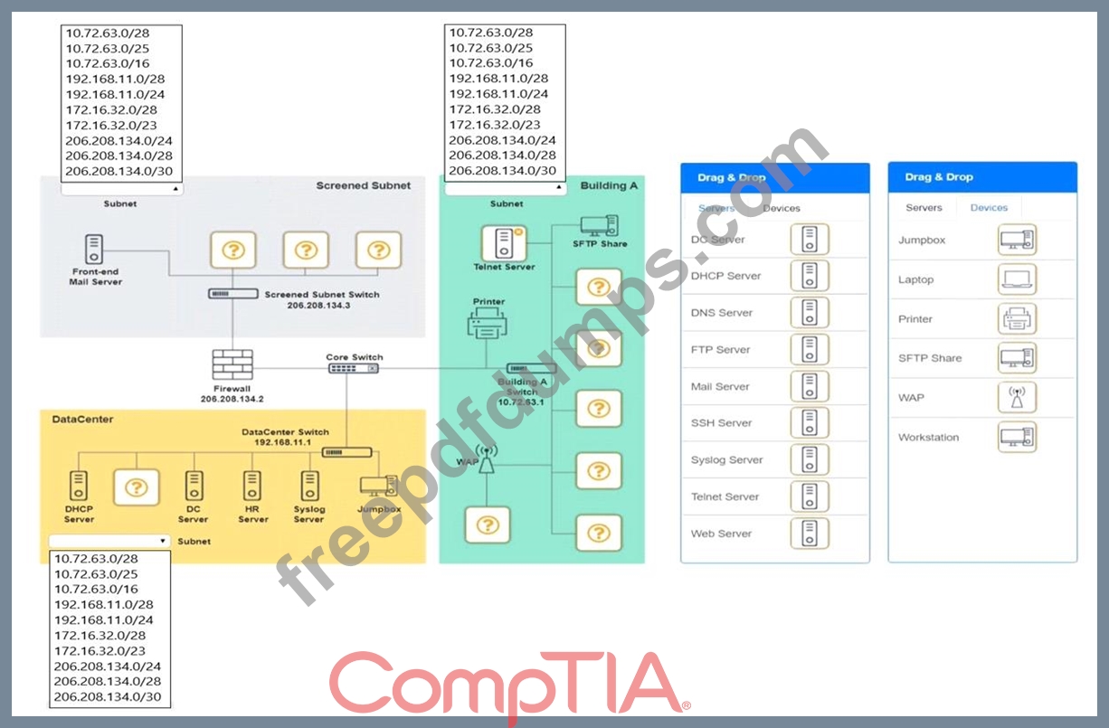 Ensure network is subnetted to allow all devices to communicate properly while minimizing address space usage Provide a dedicated server to resolve IP addresses and hostnames correctly and handle port 53 traffic Building A Ensure network is subnetted to allow all devices to communicate properly while minimizing address space usage Provide devices to support 5 additional different office users Add an additional mobile user Replace the Telnet server with a more secure solution Screened subnet Ensure network is subnetted to allow all devices to communicate properly while minimizing address space usage Provide a server to handle external 80/443 traffic Provide a server to handle port 20/21 traffic INSTRUCTIONS Drag and drop objects onto the appropriate locations. Objects can be used multiple times and not all placeholders need to be filled.