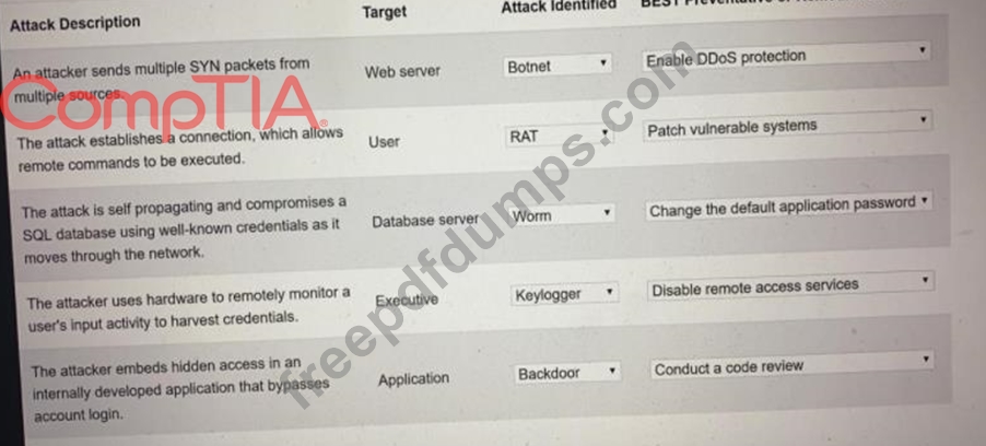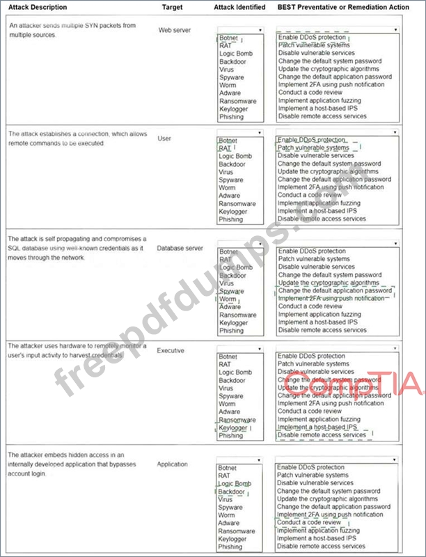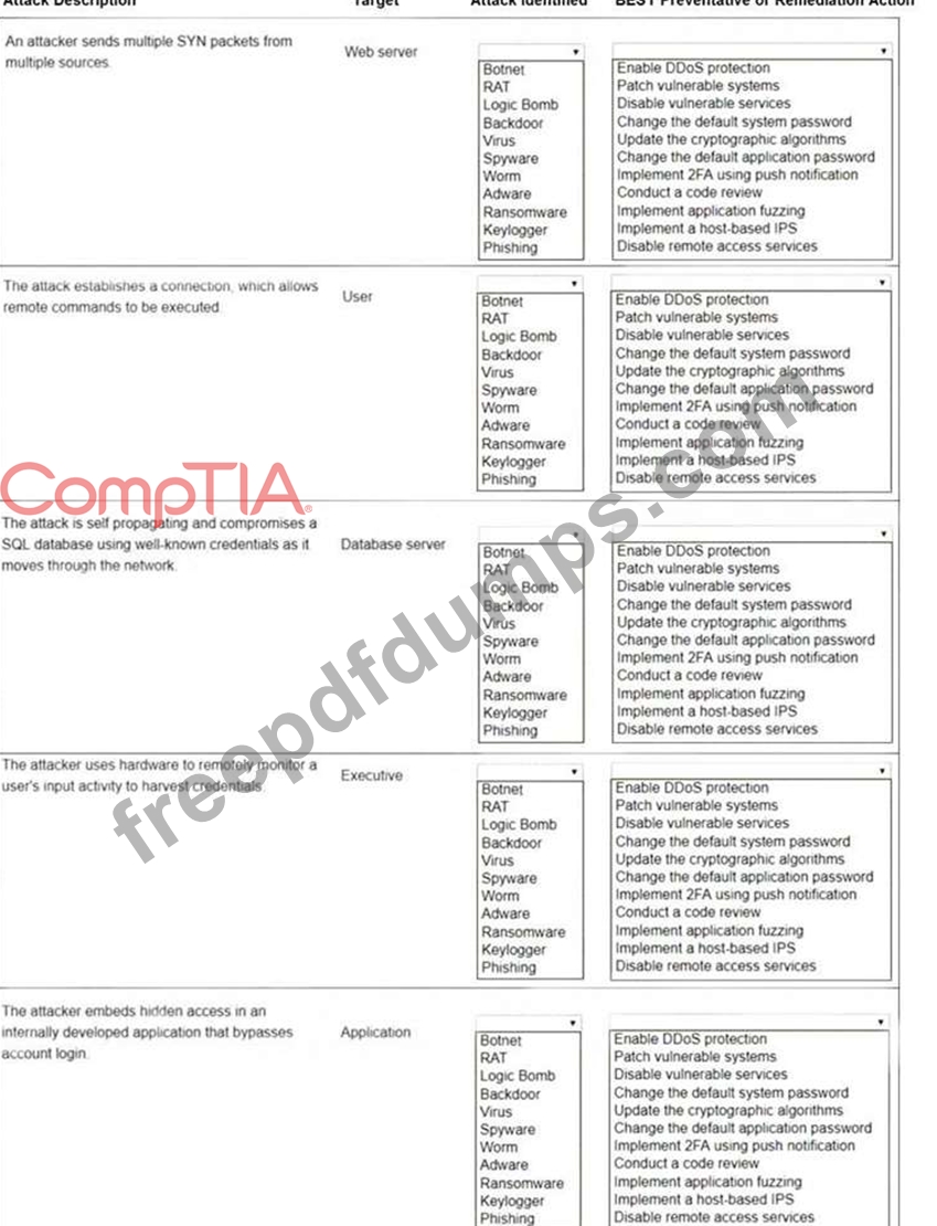 Select the appropriate attack and remediation from each drop-down list to label the corresponding attack with its remediation.