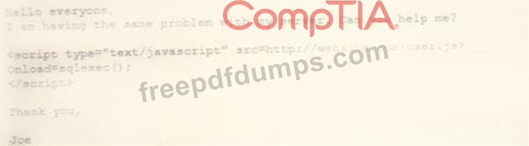 Which of the following BEST describes the attack that was attempted against the forum readers?