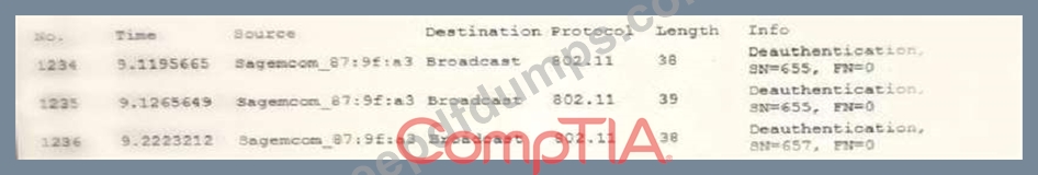 A user reports constant lag and performance issues with the wireless network when working at a local coffee shop. A security analyst walks the user through an installation of Wireshark and get a five-minute pcap to analyze. The analyst observes the following output: