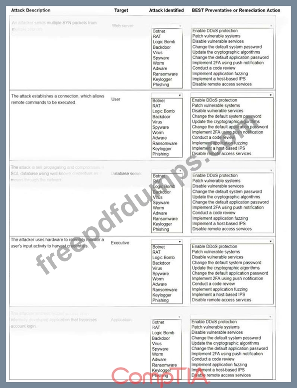 Select the appropriate attack and remediation from each drop-down list to label the corresponding attack with its remediation.