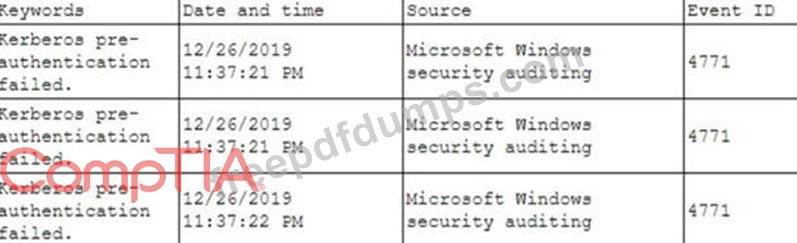 A security analyst has been asked to investigate a situation after the SOC started to receive alerts from the SIEM. The analyst first looks at the domain controller and finds the following events: