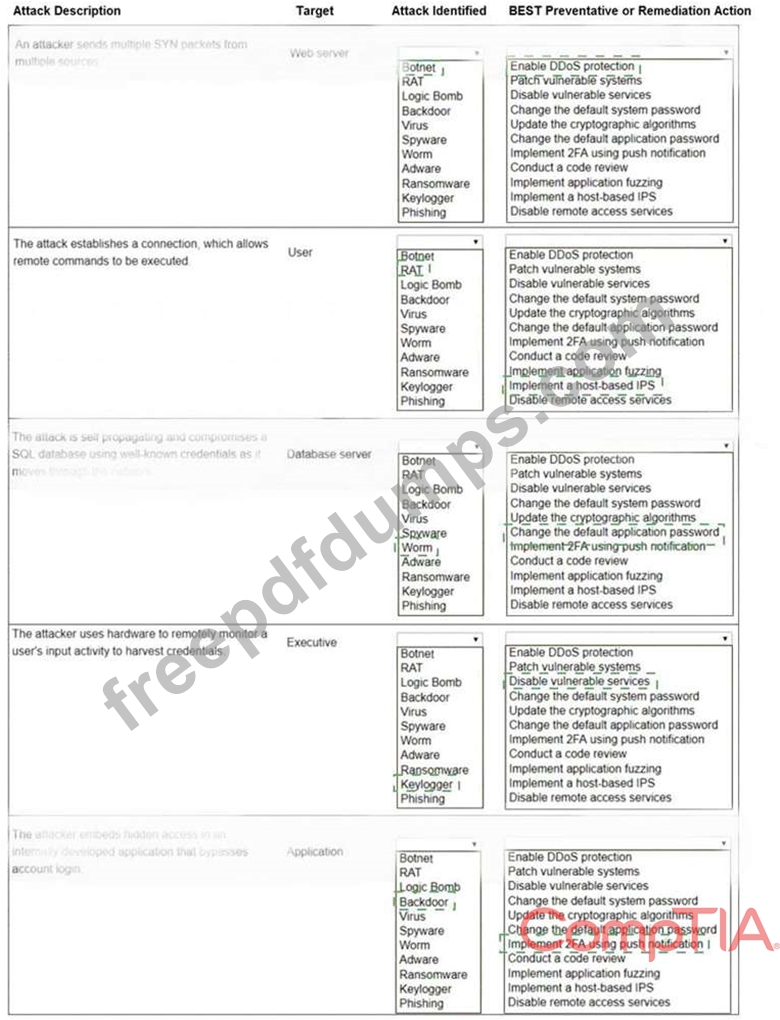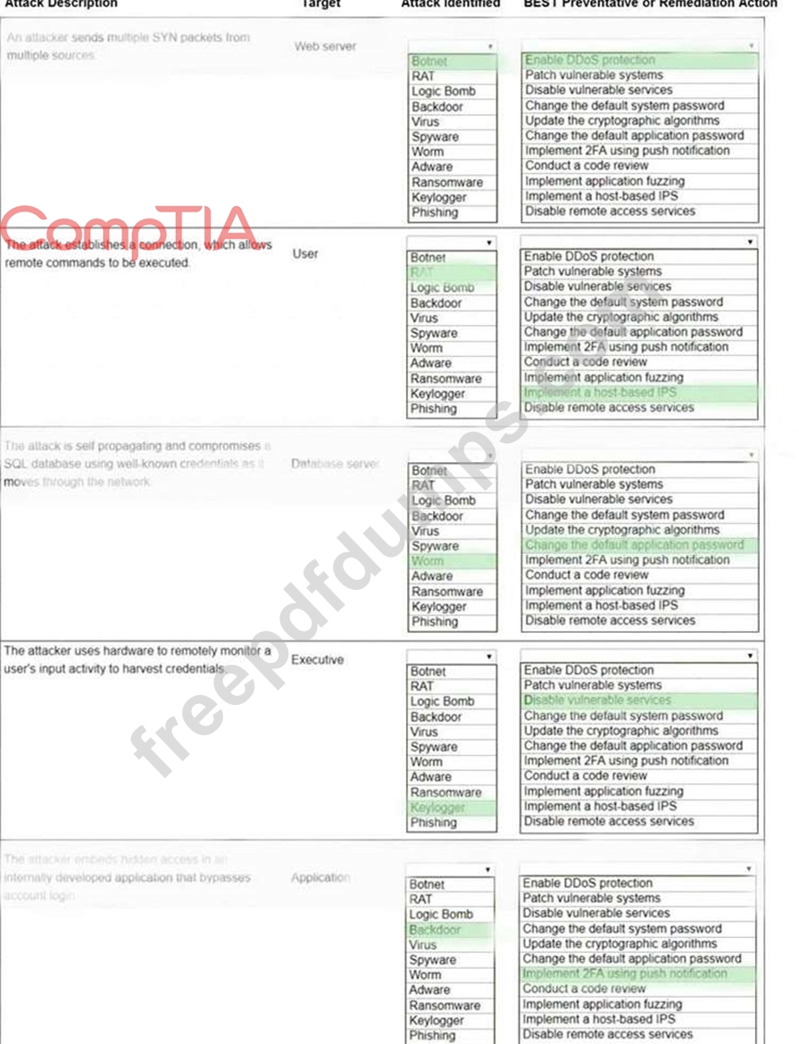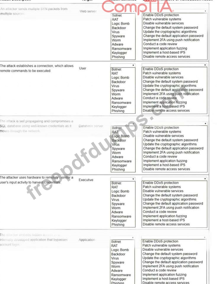 Select the appropriate attack and remediation from each drop-down list to label the corresponding attack with its remediation.