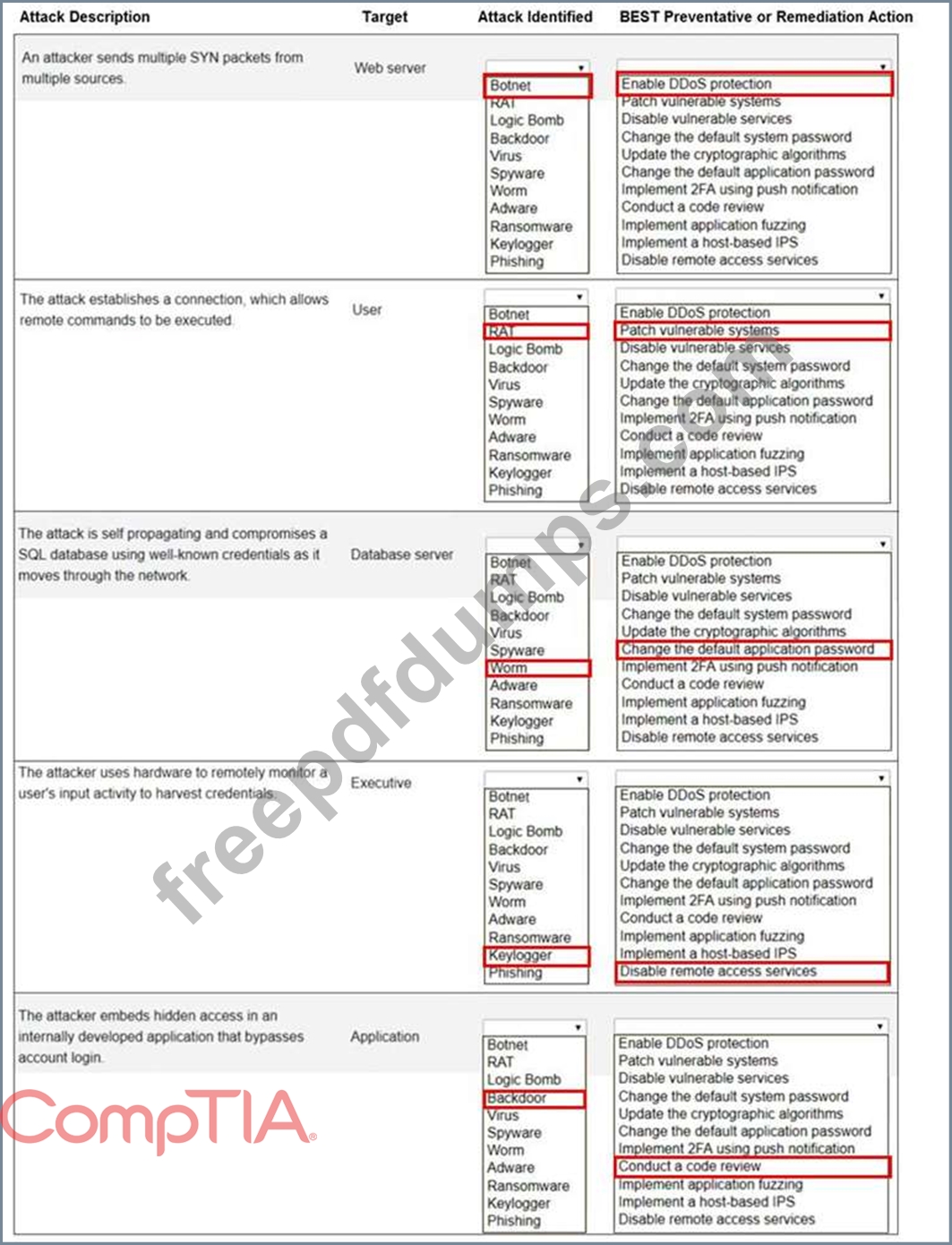 Select the appropriate attack and remediation from each drop-down list to label the corresponding attack with its remediation.